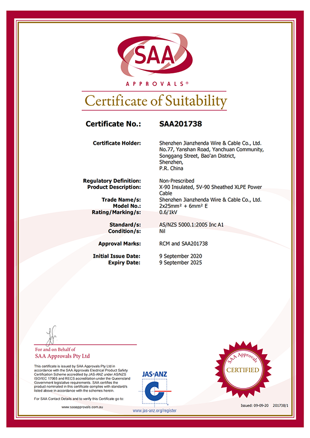 深圳建圳達電線電纜有限公司,成立于2000年,是一家電線電纜制造商,我們通過了世界各地不同市場的多數認證,如:CCC、RoHS、CB、SAA、TUV、VDE、PSE、BPS、UL、CSA。我們根據定制產品不斷更新新的認證。經過數十年的發展,我們與來自世界各地的客戶建立了長期的合作關系。我們曾經是菲律賓機場,,柬埔寨的電力站,美國的醫院,工廠,埃塞俄比亞的水電站項目。我們是一家值得信賴的電線供應商。